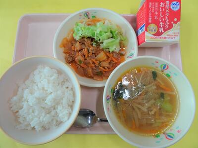 今日は沖縄料理の「タコライス」が登場です。豚肉や野菜がピリ辛味のソースで煮込まれ、ごはんにかけていただきます。さっぱり味のボイルキャベツも付いて、食べ応えがありました。スープは栄養たっぷりの切り干し大根が使われた給食ならではのスープです。
