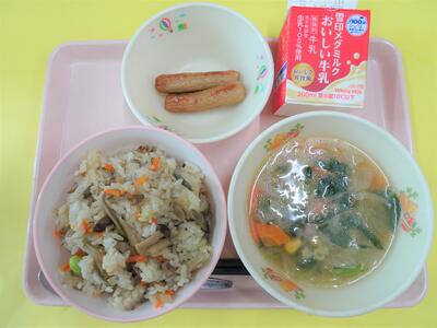 【献立】鶏ごぼうピラフ・ウインナーソテー・マカロニスープ・牛乳
