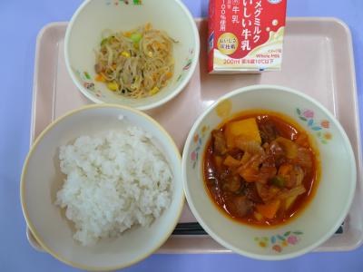 【献立】ごはん・魚のチリソース煮・白滝のつるつる炒め・牛乳