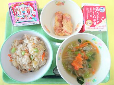 2学期給食は、今日を含めてあと3回です。今日はクリスマス気分になるフライドチキンやペンネの登場です。チキンの甘辛さペンネの酸味のあるトマト風味、そして優しい甘さの白菜スープ、どれもおいしく味のバランスも良いです。