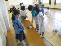 生活科「うごくうごくわたしのおもちゃ」では、ゴムの力や乾電池の重りなどを使って動くおもちゃ作りを行ってきました。ようやく完成したので、今日は試しに遊んでみました。はじめは、自分のおもちゃで遊ぶのに夢中になっていましたが、少しずつ友達の作ったおもちゃの面白い点や工夫した点などを見つけてもらいました。子どもたちの振り返りでは、「〇〇さんのぴょんコップのゴムがクロスしているところがすごい」「とことこ車の電池の動きがおもしろい」などの気付きが見られました。