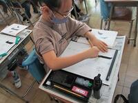 方がん用紙を使って形を書く授業を行いました。まずは長方形や正方形、直角三角形の形について復習をし、実際に書いてみました。形は何となくわかるけど、たて3㎝、横4㎝を方がん用紙にどのように描けばよいのか、今まで勉強してきた知識を活用して取り組んでいました。