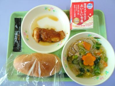 【献立】コッペパン・魚のバーベキューソース・ビーフンスープ・ごまクリーム(パン用)・牛乳