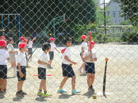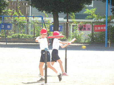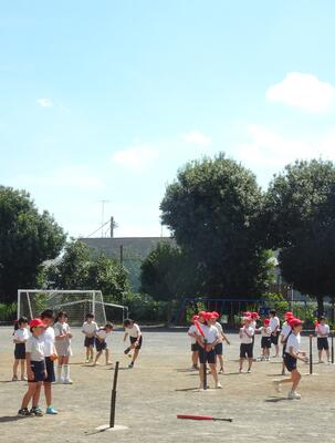 3年生はTボールのバッティング練習です。青空に気持ち良く打球がとびます!