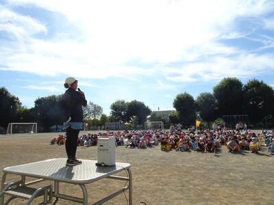 朝は全校児童が校庭に集まって出発の会です。児童会の皆さんから目標や約束がしっかり伝えられました。