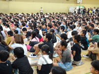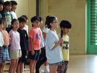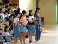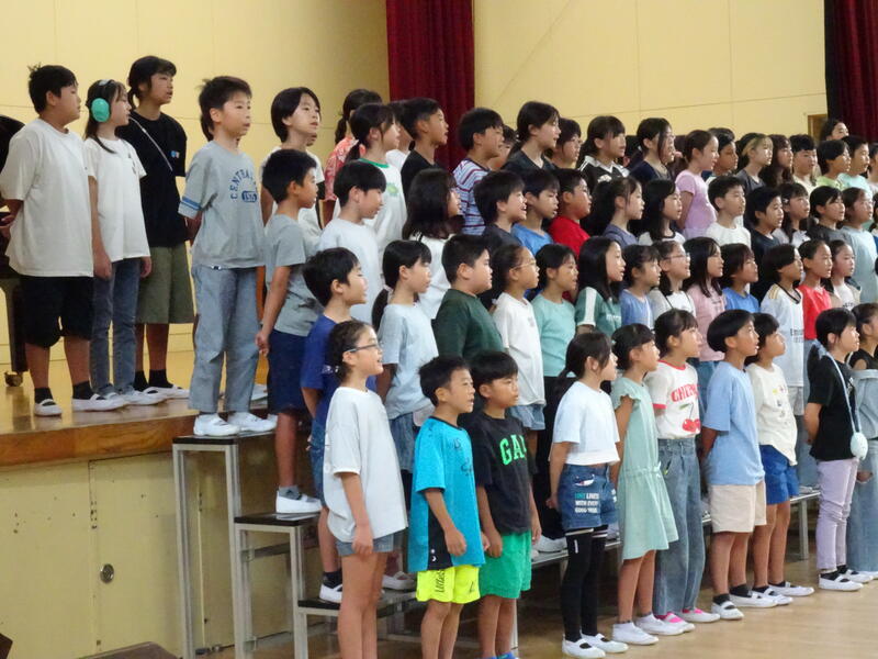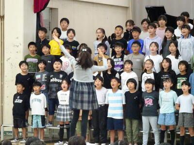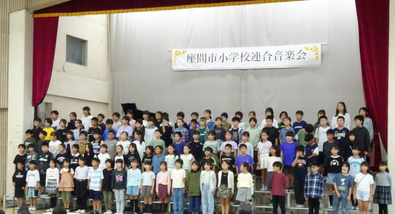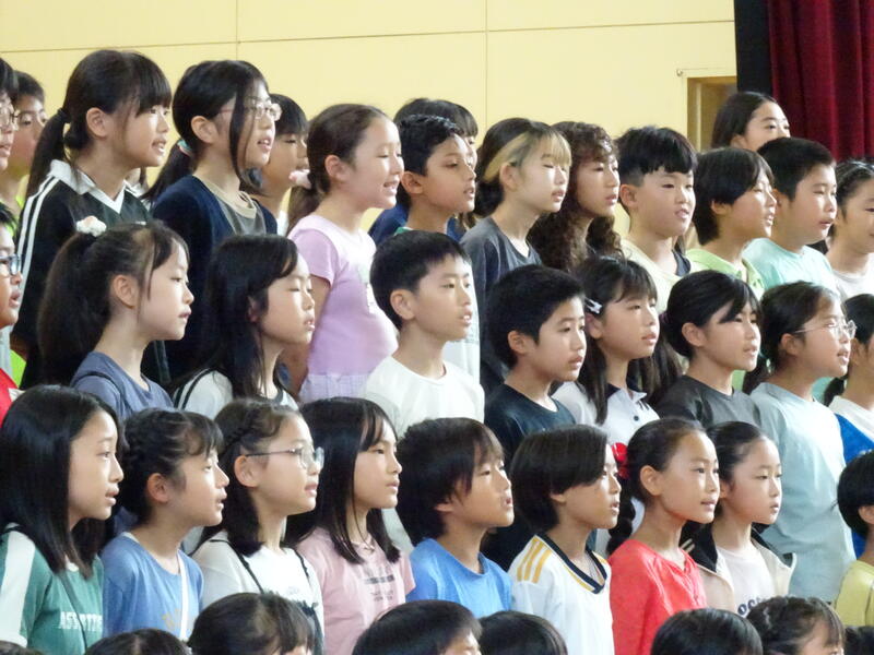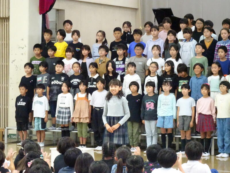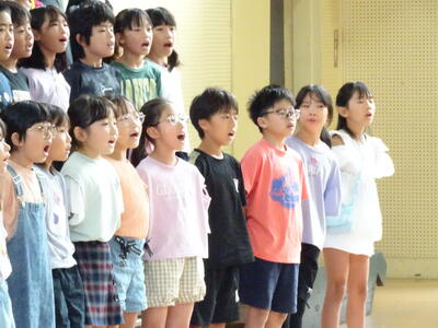 座間市連合音楽会を明日に控えた4年生が、全校朝会で歌声を披露しました。