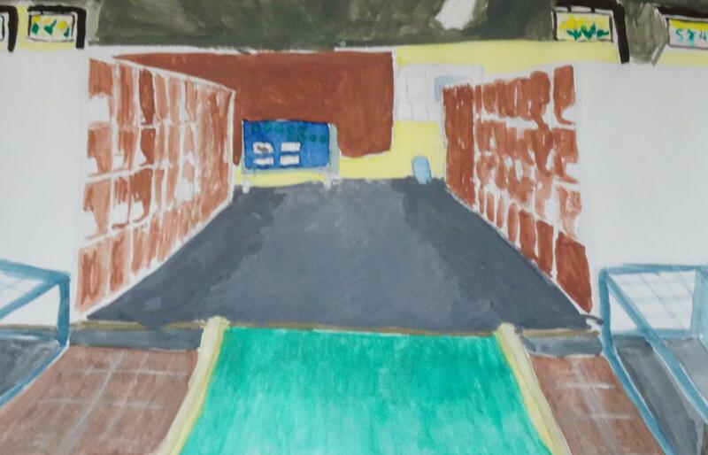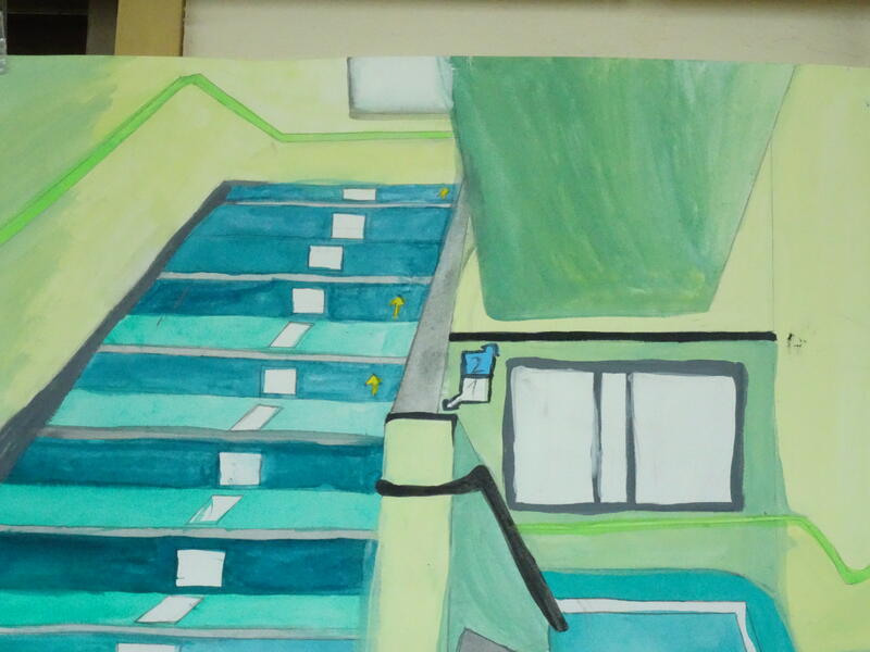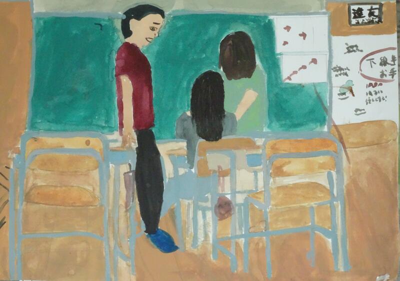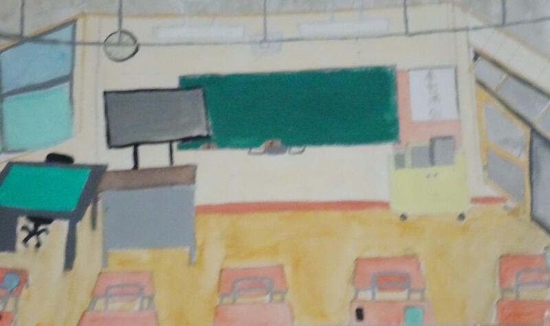 休み時間の教室、廊下、階段、校舎風景、6年間過ごした日々を思い出しながら、校舎の至る所で描いています。