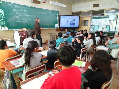 クラスごとに発表のスライドを見せながら、クイズや質問もしながら全校児童に伝えました。