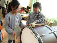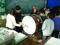 さまざまな打楽器(大太鼓・小太鼓・シンバル・グロッケン・ハンドベル)で音の出る様子を実験しました。