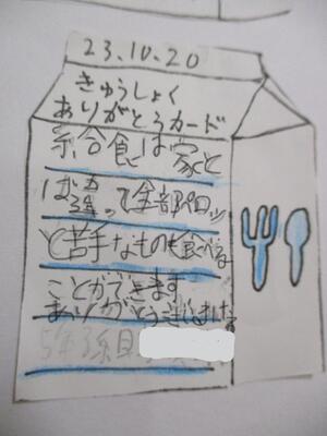 人気の洋食メニューです。アルファベットのマカロニや花形・王冠人参が入り、お腹も心も満たされる給食でした。おいしいだけでなく、皆で食べる楽しさを味わってほしい という給食室の心遣いが伝わってきます。