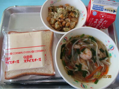 【献立】チーズパン・つみれ汁・キャンディポテト・福豆・牛乳