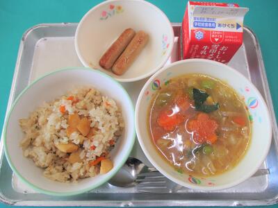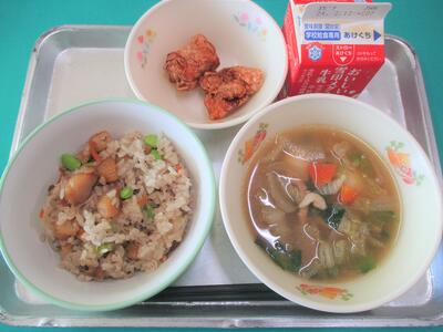 【献立】鶏ごぼうごはん・ししゃものカレー揚げ・かきたま汁・牛乳