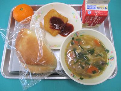 【献立】コッペパン・唐揚げ・ミルクポテト・野菜スープ・ジャム・牛乳