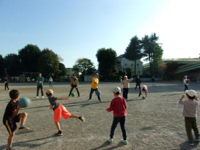 最後は、お父さん、お母さん、先生、たち野会の皆さん、みんなでドッジボールを楽しみました。