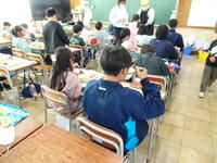 給食時は児童と同じ席に座り、久しぶりの給食を満足そうに味わっていました。