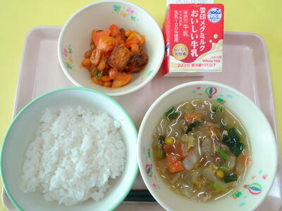 【献立】ごはん・春雨スープ・魚のオーロラソース和え・牛乳