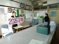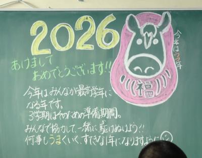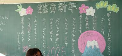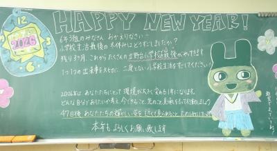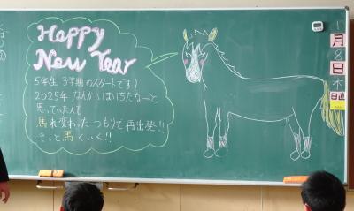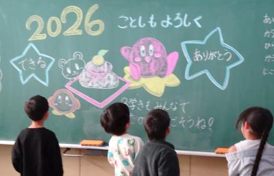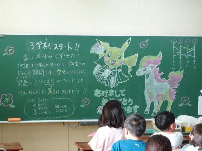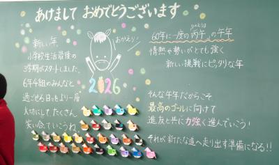 教室の黒板には、子どもたちを迎える新年のメッセージが書かれています。