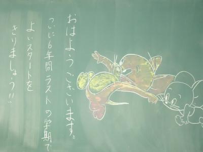 小学校最後の学期となる6年生、黒板の担任からのメッセージにも熱い思いが感じられます。