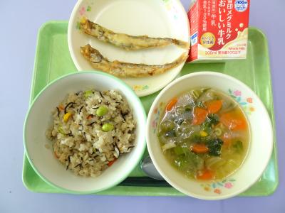野菜たっぷりのスープとひじきライスにししゃも丸揚げのフリッター、おいしさ、栄養、歯ごたえ3拍子そろった満点給食です。