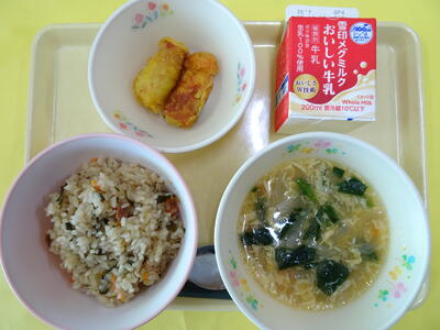 【献立】高菜チャーハン・ちくわのカレー揚げ・卵とコーンのスープ・牛乳
