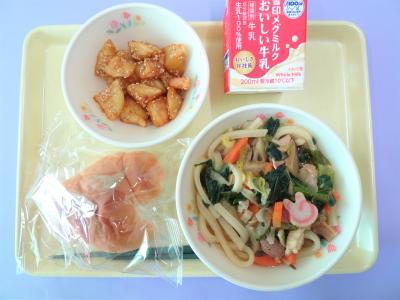 【献立】ロールパン・わかめうどん・ざぜん芋・牛乳
