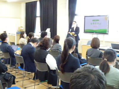 神奈川県教育委員会の総合教育センターから金子指導主事のお越しいただき、指導助言をいただきました。熱心なお話に教員たちも引き込まれ、授業づくりを学ぶとともに意欲を高めることができました。