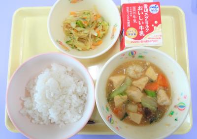 【献立】ごはん・豆腐と海老の中華煮・中華サラダ・牛乳