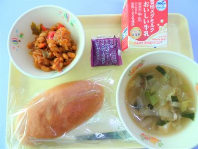 【献立】ソフトフランスパン・魚と大豆のケチャップ和え・白菜スープ・牛乳・ジャム