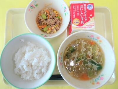 今日は沖縄料理の「タコライス」が登場です。豚肉や野菜がピリ辛味のソースで煮込まれ、ごはんにかけていただきます。さっぱり味のボイルキャベツも付いて、食べ応えがありました。スープは栄養たっぷりの切り干し大根が使われた給食ならではのスープです。
