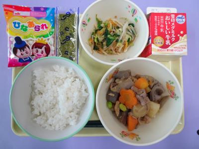 【献立】ごはん・がめ煮・菜の花和え・のり・雛あられ・牛乳