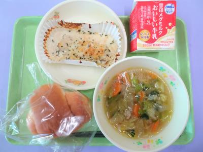 【献立】ロールパン・魚のハーブ焼き・チキンスープ・牛乳