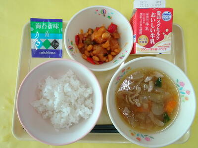 冬野菜の大根が洋風スープになって登場です。大根の甘み、ベーコンのコクが合わさり満足感のある一品でした。大豆と魚のケチャップ和えは給食オリジナルの健康献立です。
