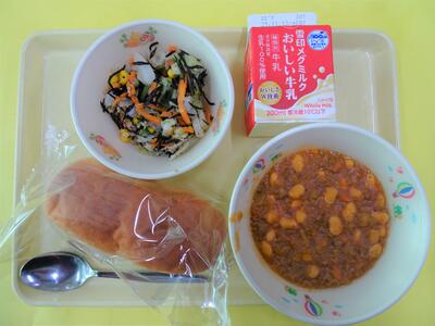 インド煮はトマトの酸味と豆のホクホク感そしてひき肉のうま味が合わさりソフトフランスパンに良く合う美味しさでした。爽やかな味付けのひじきサラダは給食ならではの一品です。