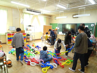 たひみ級では、コミスクのサポーターさんを講師みお迎えし、バルーンアートづくりを高学年の児童で体験しました。